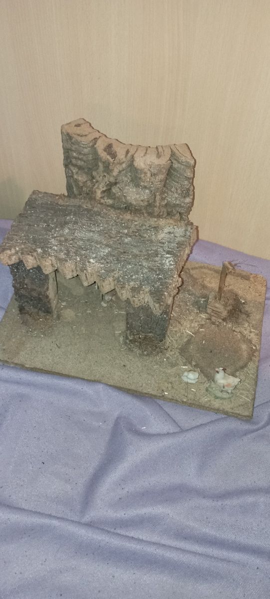 Portal de Belén para pesebre. Está un poco desgastado, el soporte y el árbol decorativo. Tiene algúna figura de animal incorporada.