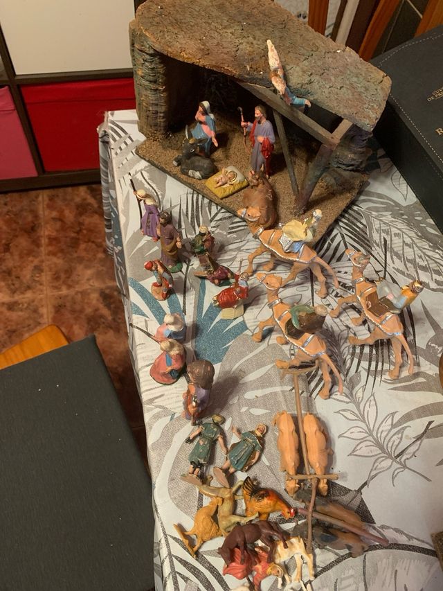 Detalles del productoCompleto portal de belén con figuras de Reyes Magos, camellos y animales.