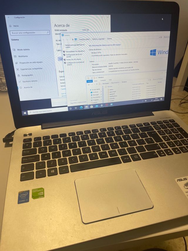 Intel core i7 5500u cpu 2.40 ghz, ram 8gb, window 10. Portátil en perfectas condiciones y con batería de carga.