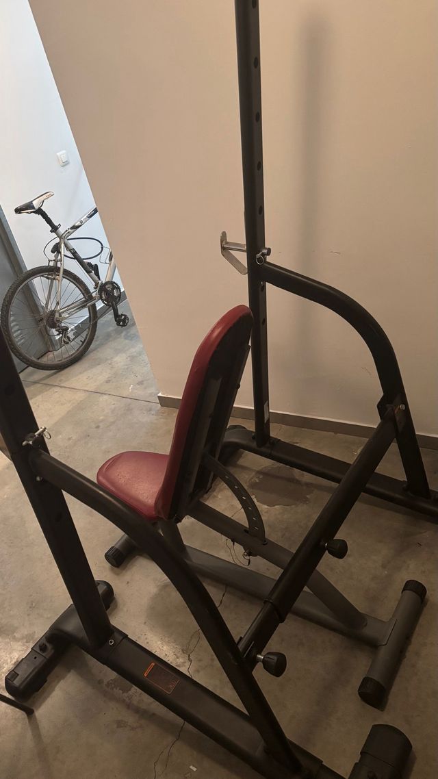 Equipo de gimnasio para entrenar en casa. - Portería para barra. - Banco regulable.