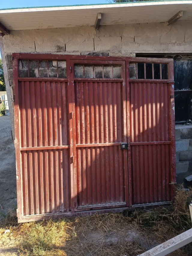 Detalles del productoPortón de hierro de una sola hoja y una puerta de apertura con detalles de rejas sin cristal y su marco a farta de pintarlo.