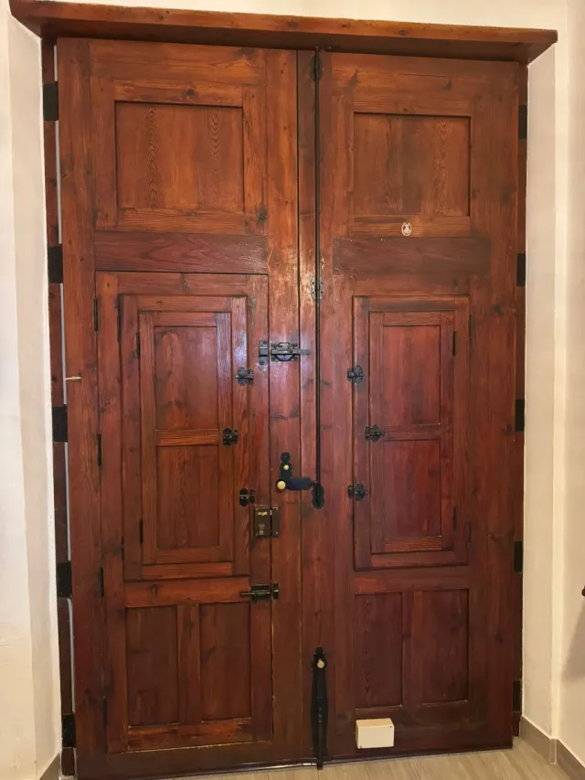 Portón de madera maciza con un diseño rústico y robusto. - Fabricado en madera de alta calidad. - Acabado en tono oscuro. - Herrajes metálicos negros.