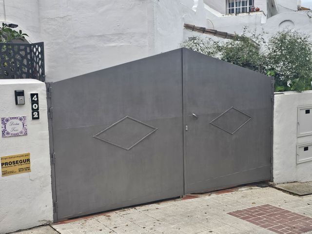 Detalles del productoPortón de hierro de dos hojas con una medida total de 390cm de ancho. Diseño con rombos.