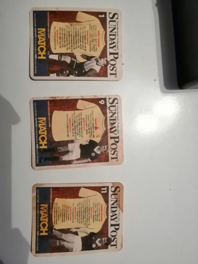 - Cada posavasos presenta un jugador diferente: Andy Goram, Denis Law y Graeme Souness.