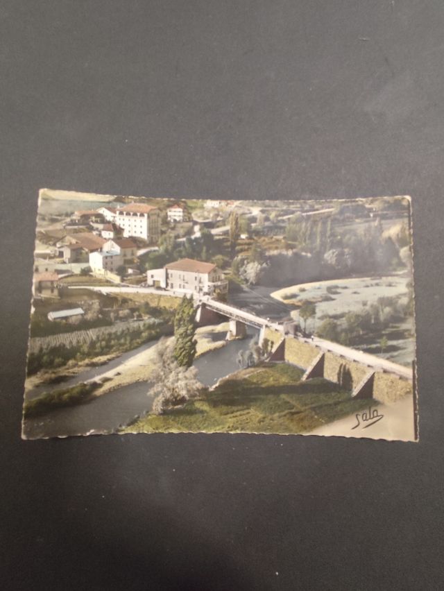 Postal antigua de Bellver de Cerdanya. 1955 Coloreadas y escrita - Vista del pueblo con puente y río Segre
