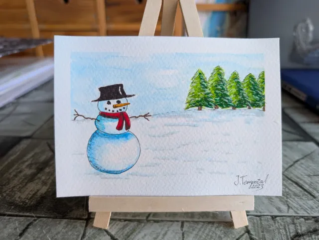 Detalles del productoPostal navideña pintada a mano con acuarela. Representa un muñeco de nieve con bufanda roja y sombrero negro, frente a un paisaje nevado con árboles de Navidad.