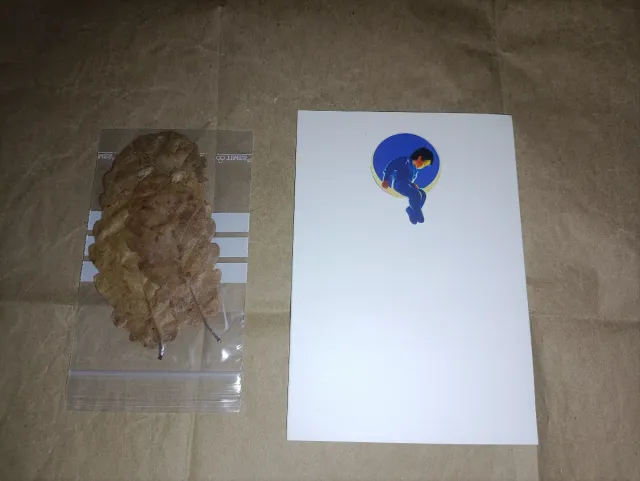 Detalles del productoPostal con el logo del rancho de Michael Jackson, Neverland y tres hojas de los arboles de la entrada de dicho rancho, fueron recogidas del suelo en la misma entrada en California, Estados Unidos.