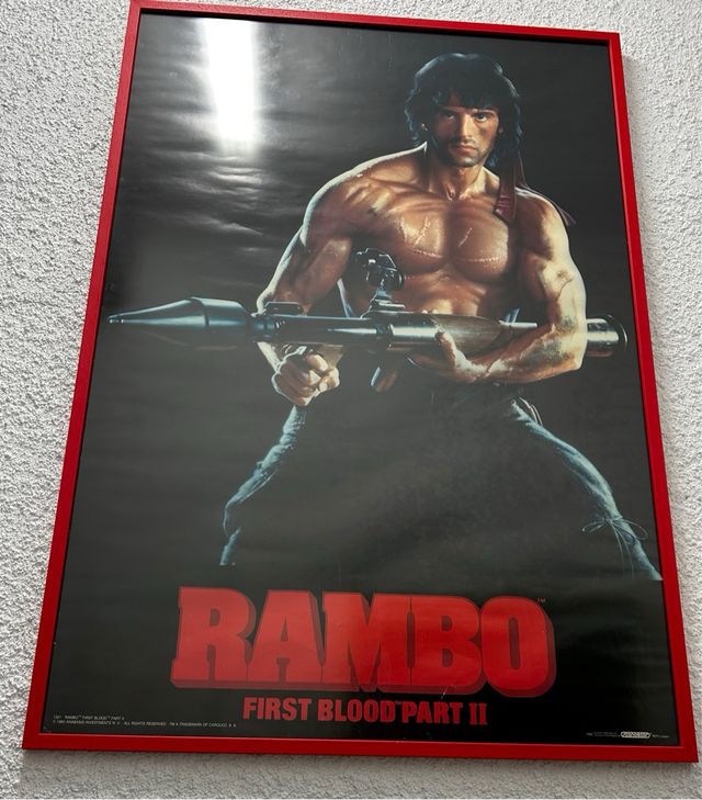 Póster 1985 original de la película RAMBO First Blood Parte II. Enmarcado con marco de madera rojo y metacrilato. En perfectas condiciones. Artículo de colección.