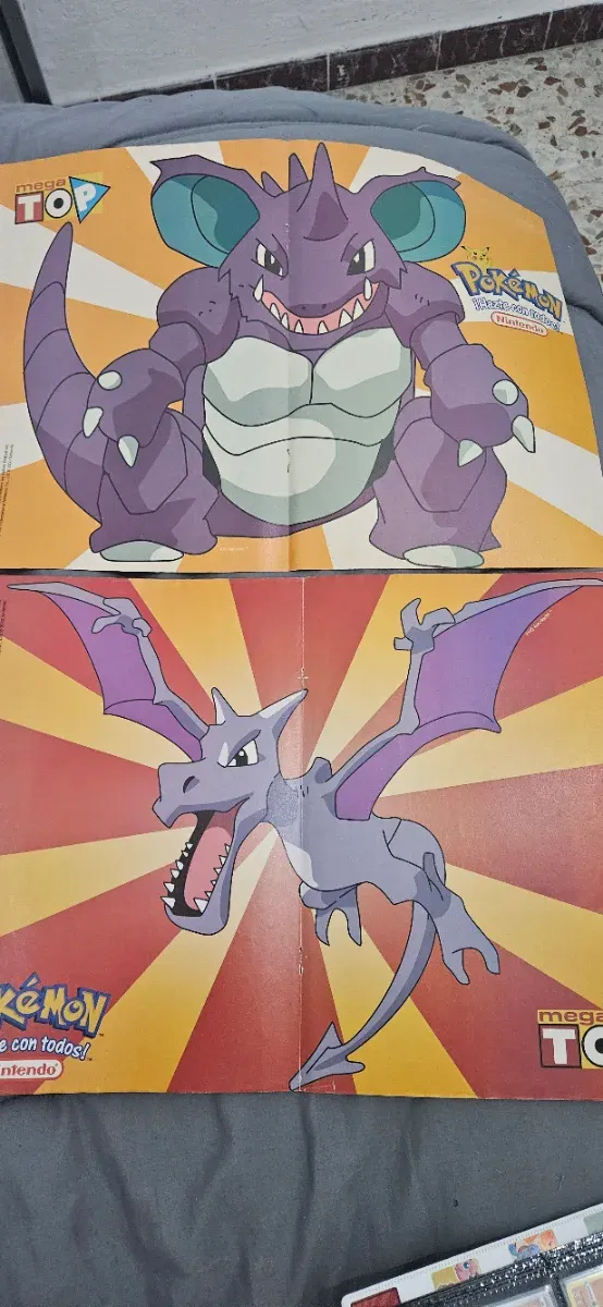 Póster doble de Pokémon con Nidoran Macho y Aerodactyl. - Ilustraciones a todo color. - Incluye logos de Mega TOP y Nintendo.