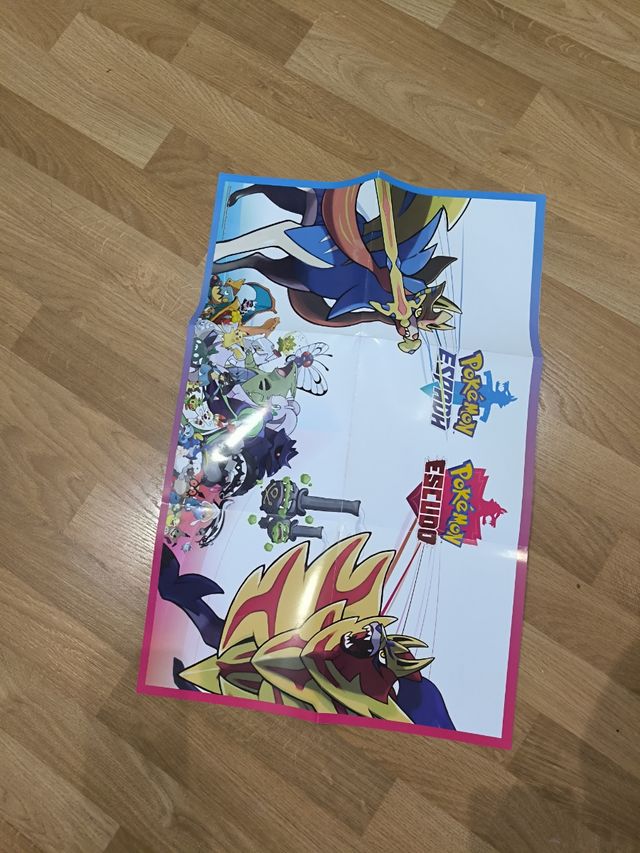 Detalles del productoPoster promocional original de doble cara de los videojuegos Pokémon Espada y Pokémon escudo. En perfectas condiciones, 38x58. Exclusivo de reserva del juego.