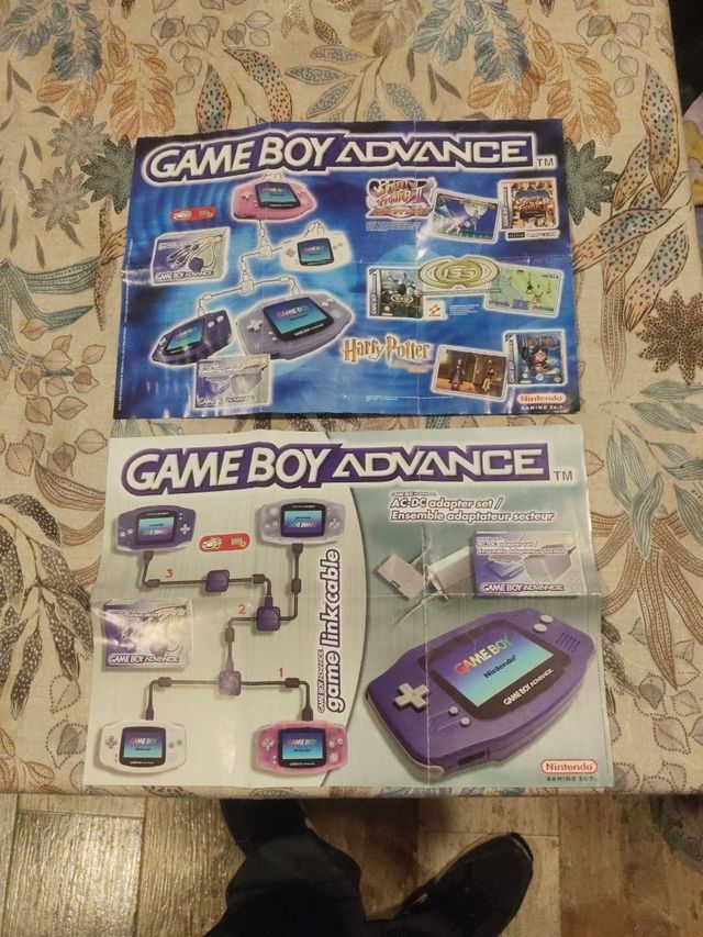 Póster promocional del videojuego Game Boy Advance. - Muestra diferentes consolas y juegos. - Incluye imágenes de Harry Potter.