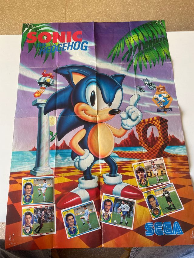 Detalles del productoPóster promocional del videojuego Sonic the Hedgehog para SEGA Mega Drive. Presenta a Sonic y varios jugadores de fútbol.