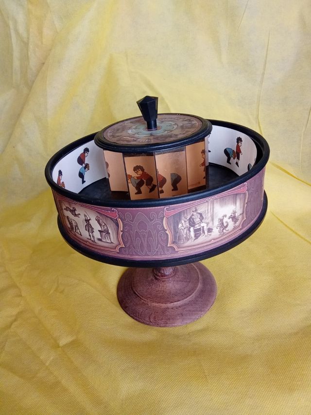 Detalles del productoPraxinoscopio de madera, en buen estado. Se incluye un cilindro con imágenes. Ideal para coleccionistas de juguetes antiguos. - Mecanismo giratorio. - Cilindro con imágenes. - Base de madera.