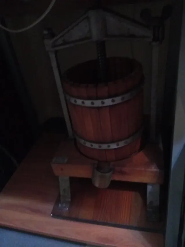 Prensa antigua de madera, ideal para coleccionistas o como elemento decorativo. - Estructura de madera. - Aros metálicos de sujeción. - Mecanismo de tornillo.