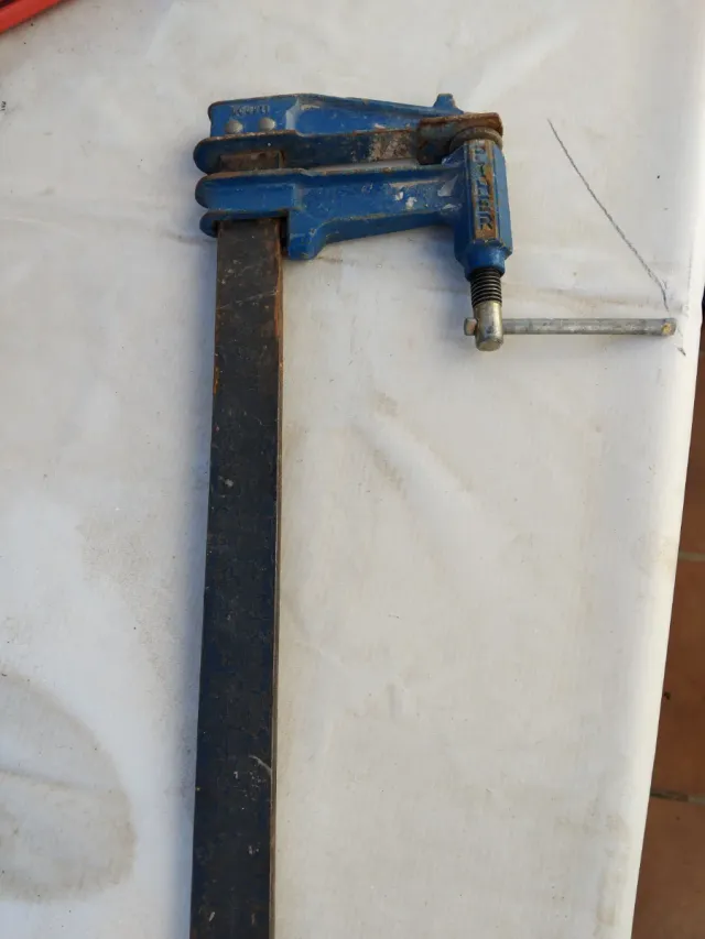 Prensa de carpintero de gran tamaño, ideal para trabajos de madera. - Color azul. - Barra metálica. - Mango giratorio.