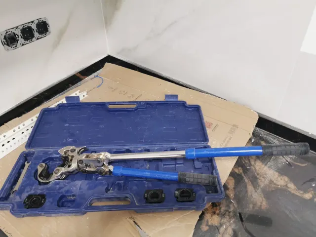 Herramienta manual para prensar tubos multicapa. Incluye maletín y accesorios. - Prensa manual robusta. - Maletín de transporte. - Juego de mordazas.