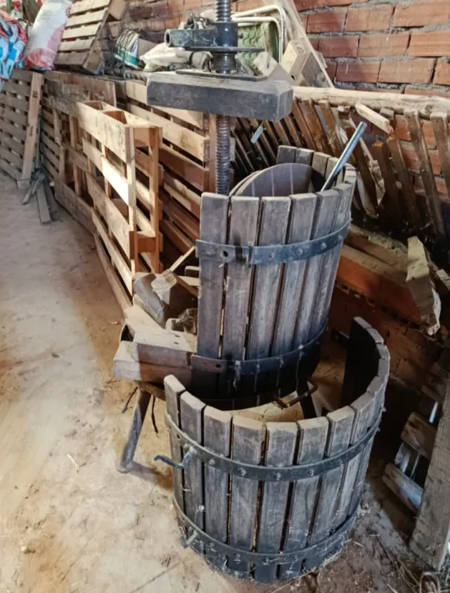 Prensa tradicional de madera, ideal para hacer vino o como elemento decorativo. - Construcción robusta en madera. - Aros metálicos de sujeción.