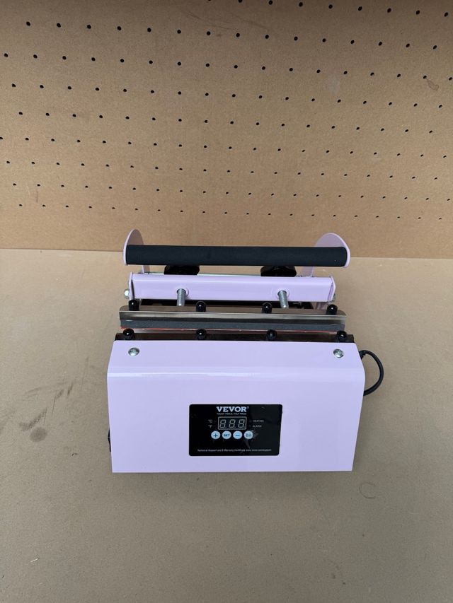 Prensa térmica VEVOR en color rosa, ideal para sublimación de tazas. - Panel de control digital. - Ajuste de temperatura y tiempo. C10/13
