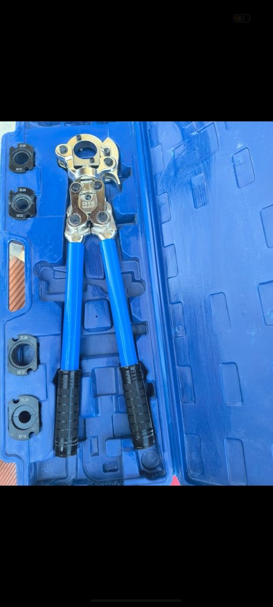 Herramienta para prensar tuberías multicapa. Incluye diferentes boquillas para distintos diámetros.