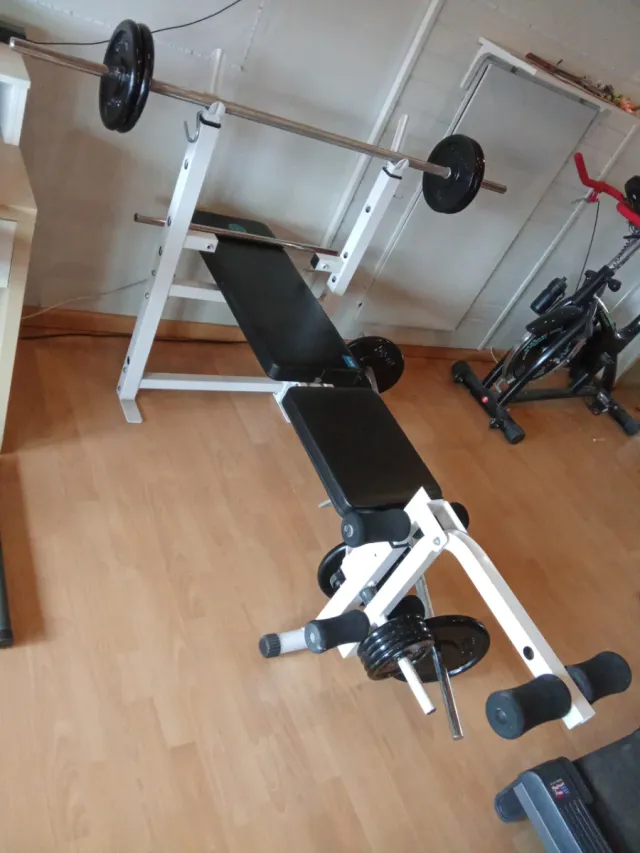 Press de banca con estructura metálica blanca y asiento negro. - Respaldo ajustable. - Soporte para pesas. - Ruedas para las piernas.