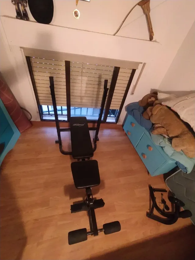 Press de banca, tiene para hacer pierna, 2 barras de 10kg, 2 mancuernas de 2kg, 4 pesas de 5kg, 3 pesas de 10kg, 8 pesas de 1kg y 4 pesas de 2kg por 300€ negociable