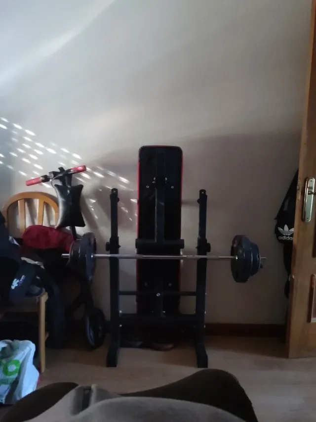 Equipo de gimnasio para entrenar en casa. - Press de banca con estructura negra y acolchado rojo. - Incluye barra. - Incluye discos de pesas.