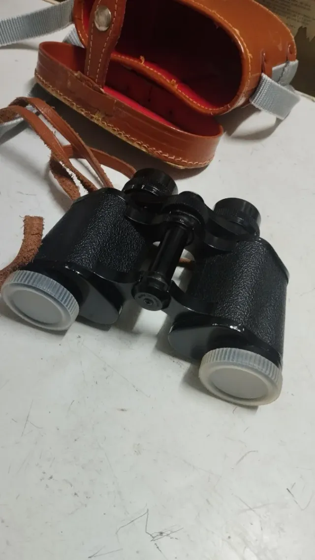Prismáticos vintage en color negro, perfectos para coleccionistas o para uso. - Incluyen funda de cuero marrón. - Correa de transporte de cuero y tela.