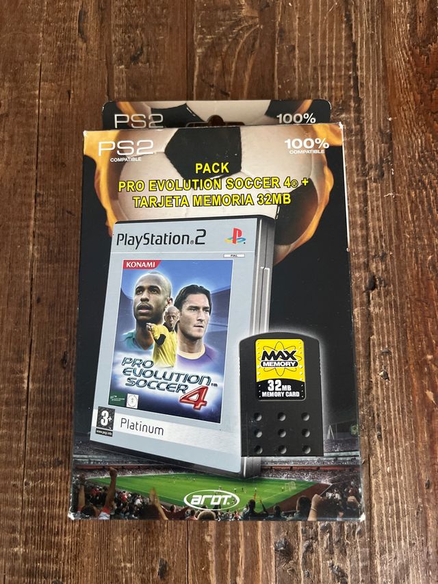 Pack de Pro Evolution Soccer 4 para PlayStation 2 junto con una tarjeta de memoria de 32MB.