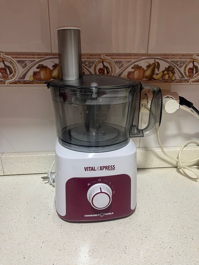 Detalles del productoProcesador de alimentos Vital Xpress en color blanco y burdeos, con accesorios incluidos. Ideal para preparar tus comidas.