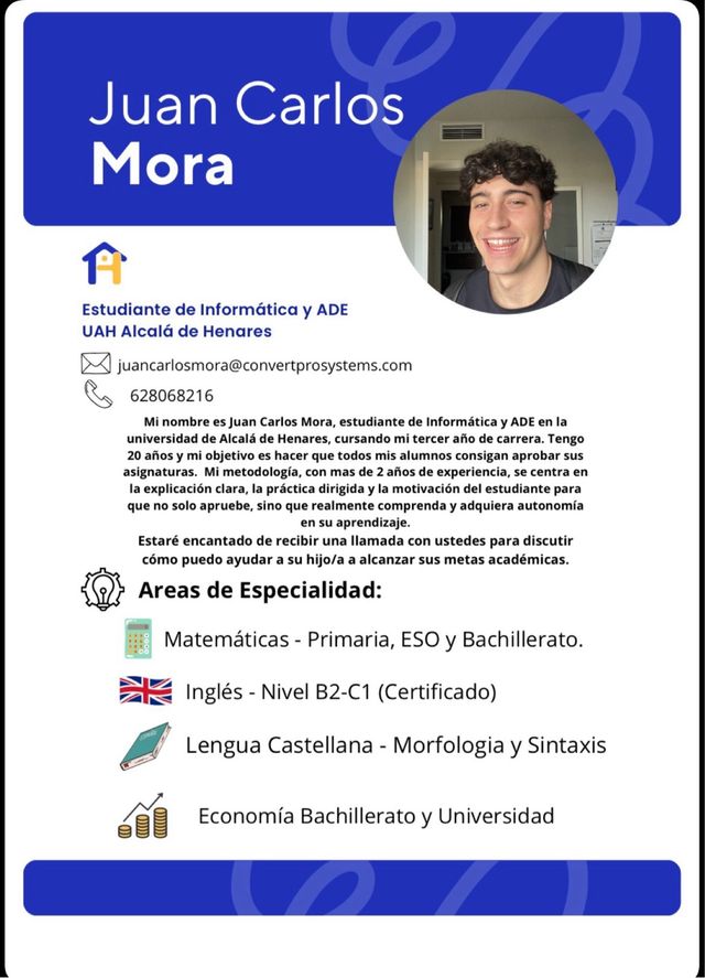 Detalles del productoMi nombre es Juan carlos mora, profesor particular con 2 años de experiencia de Matemáticas, Ingles, lengua castellana y Economía. Mi metodología esta dirigida y se centra en la motivación y enseñanza a mis alumnos, desarrollando y mejorando su capacidad de aprendizaje.
