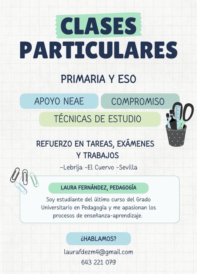 Detalles del productoMe llamo Laura, estudio el último curso del Grado Universitario en Pedagogía. Me considero una persona autocrítica con capacidad de adaptación, apasionada por los procesos de enseñanza-aprendizaje y con muchas ganas de mejorar respecto mi presente y futura profesión: La educación. ¿Quieres conocerme más? Háblame sin compromiso :)