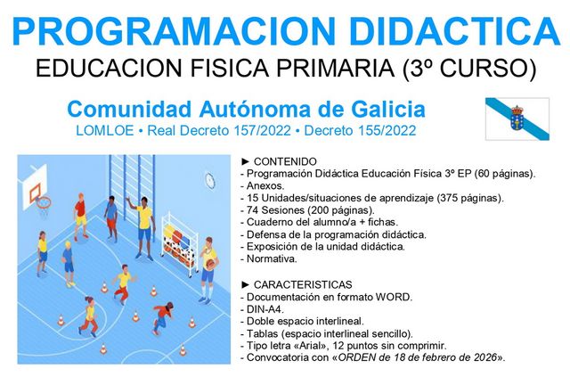 Detalles del productoProgramación LOMLOE para Maestros de Educación Física Primaria 2025-26 (3º CURSO). Real Decreto 157/2022, y Decreto 155/2022. En base a la convocatoria con «Orden de 18 de febrero de 2026» (Comunidad Autónoma de GALICIA). En formato editable. Paso muestra para que valores, información del contenido, forma de pago y envío.