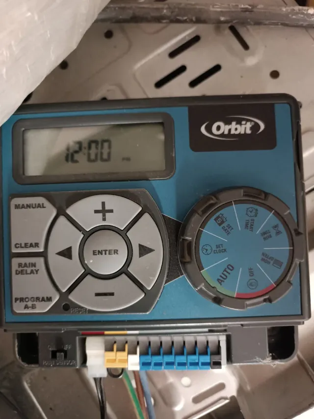 Detalles del productoProgramador de riego Orbit con pantalla digital y dial giratorio para ajustes.