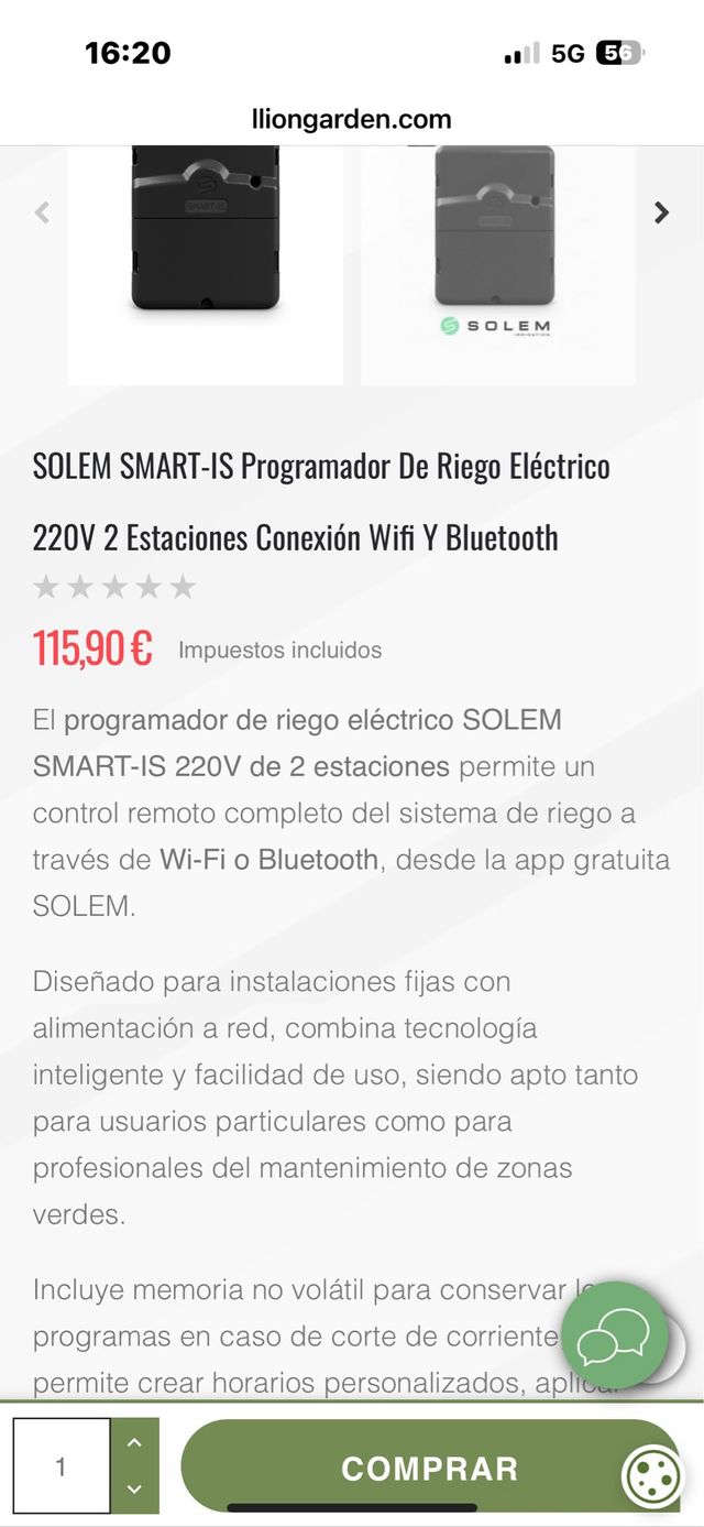 Detalles del productoProgramador de riego eléctrico SOLEM SMART-IS de 2 estaciones con conexión Wifi y Bluetooth.