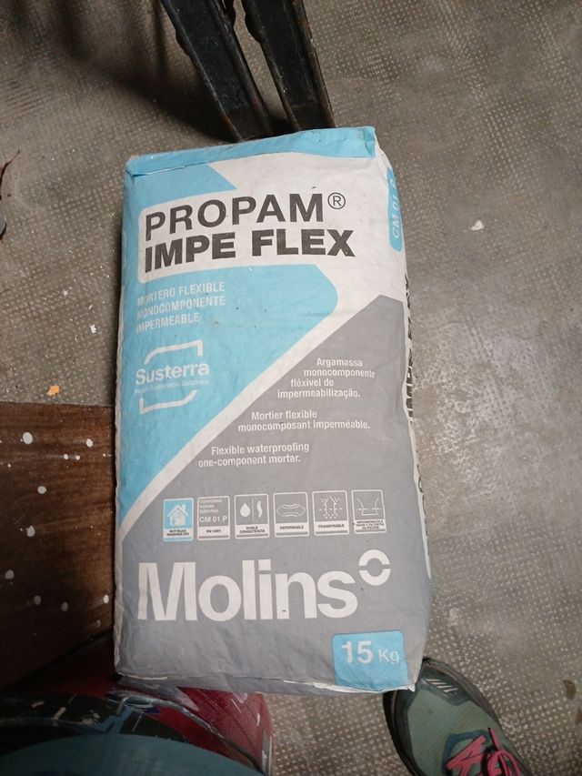 Detalles del productoDos sacos de mortero impermeable Propaam Impe Flex de 15kg cada uno. Ideales para impermeabilizar piscinas. Se encuentran en buen estado.