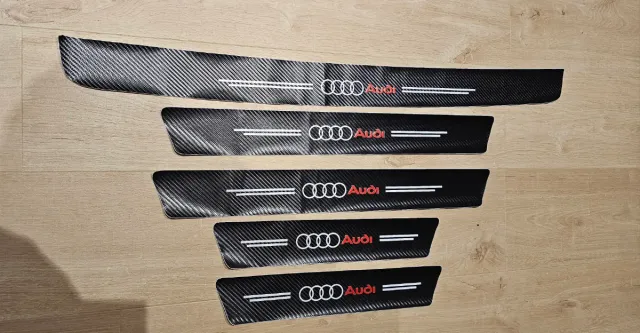 Detalles del productoSet de protectores de umbral de puerta con diseño de fibra de carbono para Audi. Incluyen el logo de Audi en color rojo.