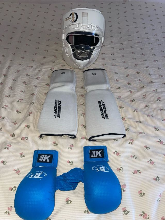 Conjunto de protecciones para karate. - Casco protector blanco. - Guantes de protección azules. - Empeineras blancas. - Regalo, mochila incluida