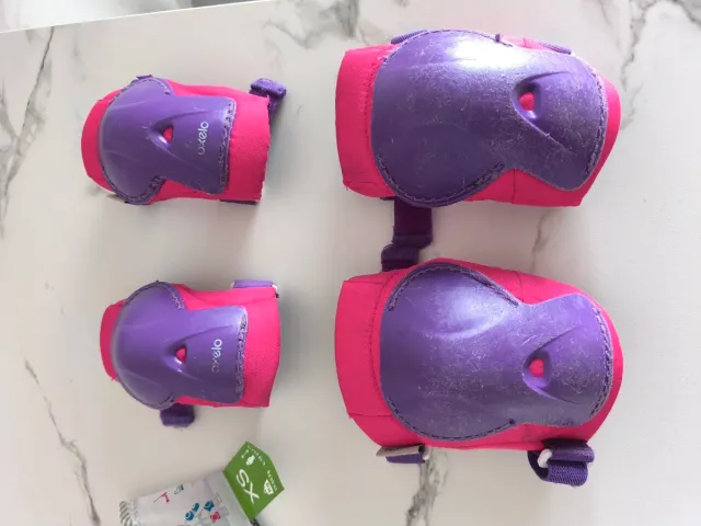 Set de protecciones para codos y rodillas de la marca Oxelo. - Color rosa y morado. - Talla XS.