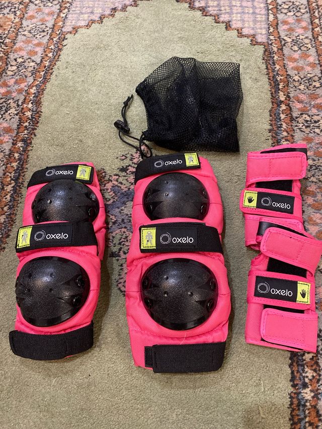 Detalles del productoSet de protecciones Oxelo en color rosa brillante, ideal para patinaje o ciclismo.