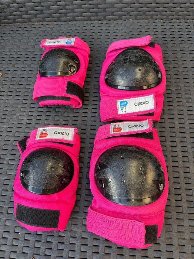 Detalles del productoSet de protecciones de la marca Oxelo en color rosa fucsia, ideal para patinaje o ciclismo. Incluye protecciones para rodillas y codos.