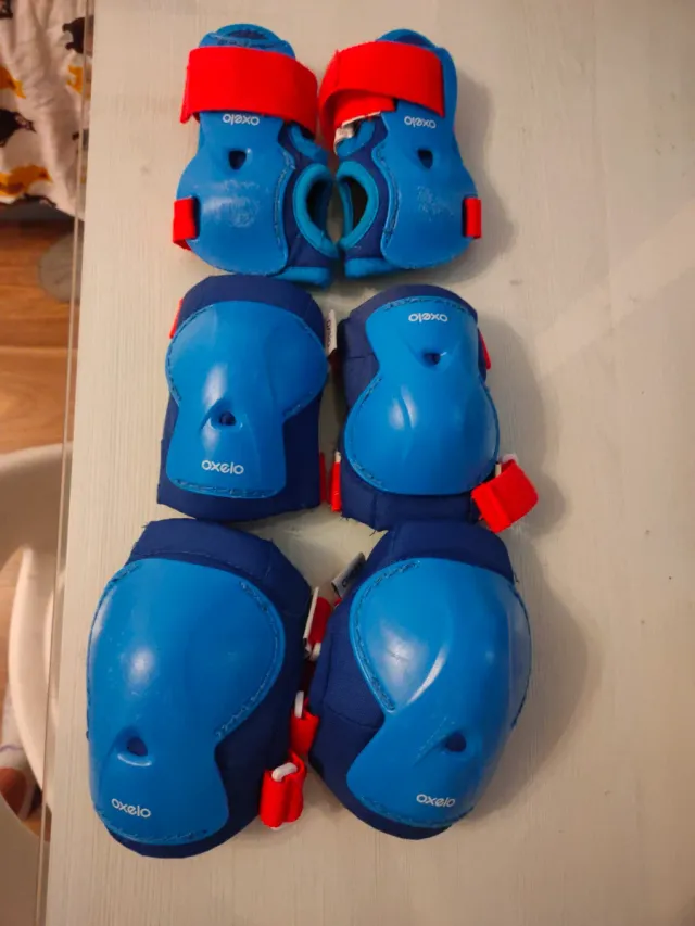 Set de protecciones Oxelo para patinaje. - Incluye rodilleras, coderas y muñequeras. - Color azul con detalles en rojo. - Cierre de velcro ajustable.