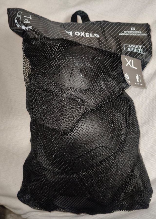 Set de protecciones Oxelo para patinaje o ciclismo. - Talla XL (Adulto). - Incluye 3 protecciones. - Color negro. - Bolsa de malla para guardarlas.