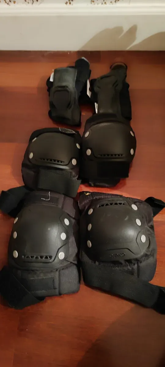 Detalles del productoSet de protecciones para patinaje o deportes de riesgo. Incluye rodilleras, muñequeras y coderas.
