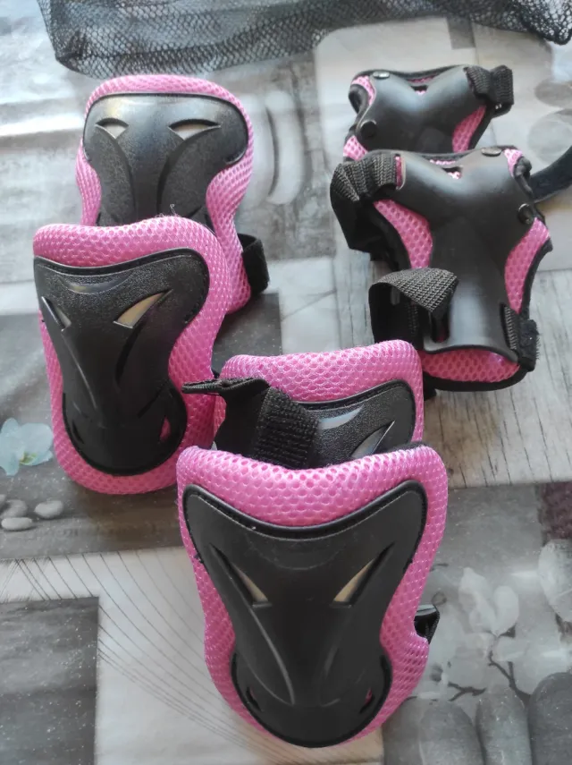 Set de protecciones para patinaje, incluye muñequeras,rodilleras y coderas. - Color rosa y negro. - Cierre con velcro ajustable. - Material resistente y acolchado.