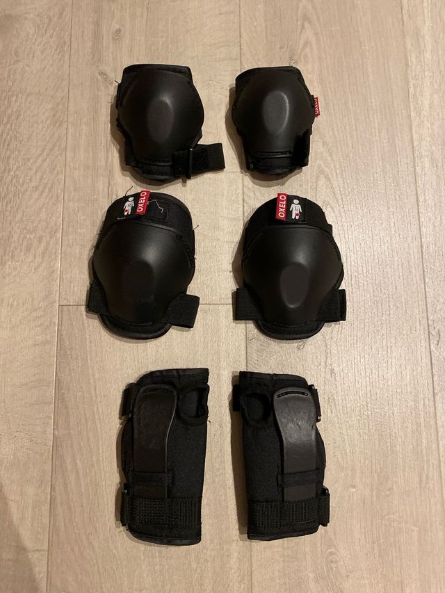 Set de protecciones para patinaje marca Oxelo. - Incluye rodilleras y coderas. - Incluye muñequeras. - Cierre con velcro ajustable. - Incluye red para guardarlo.