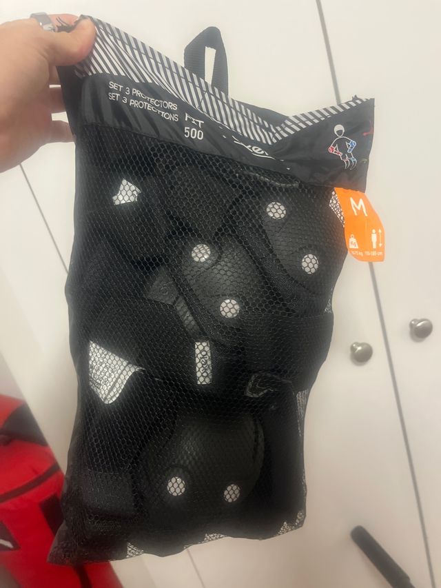 Detalles del productoJuego de protecciones para patinete o skate, talla M. El juego incluye 3 protecciones: rodilleras, coderas y muñequeras. Están en perfecto estado y se venden en su bolsa original. - Nuevas - Talla M - 3 protecciones