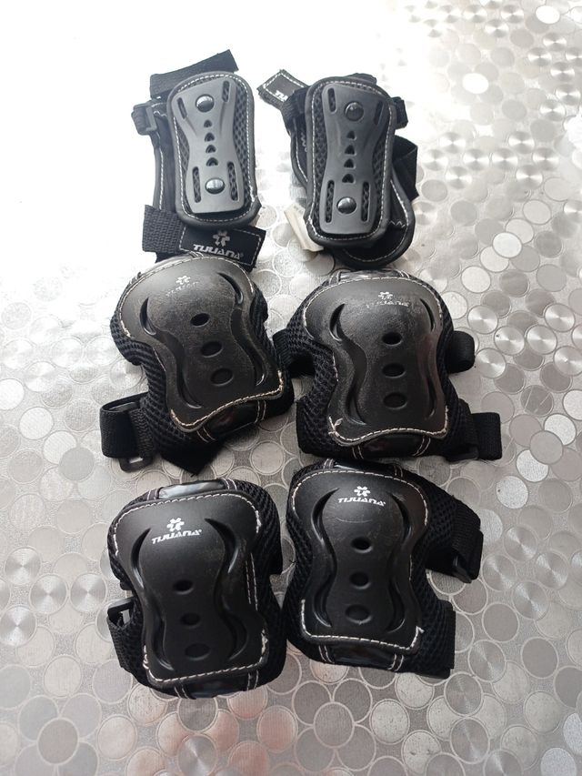 Set de protecciones para patinaje o patinete. - Incluye muñequeras, coderas y rodilleras. - Diseño ergonómico y acolchado. - Cierre con velcro ajustable.