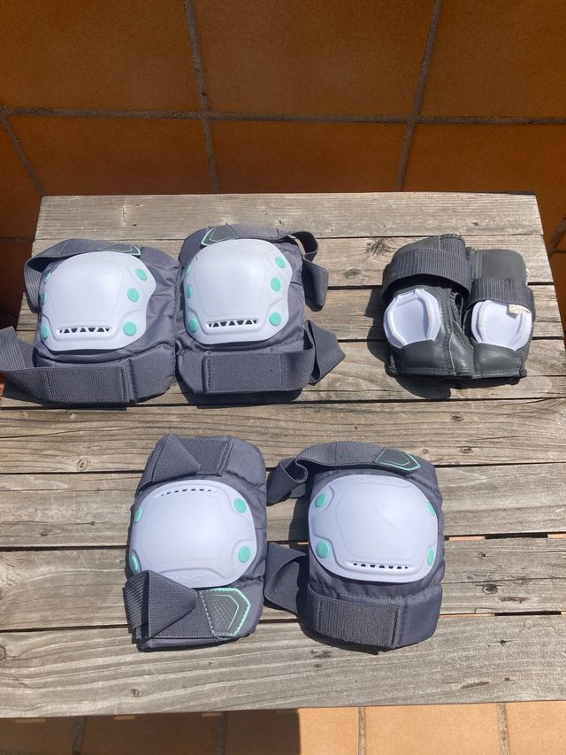 Juego de protecciones para skate Oxelo, talla M. Están prácticamente nuevas. - Incluye rodilleras, coderas y muñequeras. - Color gris y turquesa.