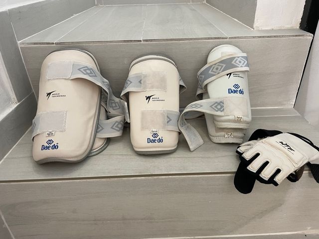 Set de protecciones para Taekwondo de la marca Daedo. Incluye protecciones para espinillas y brazos talla S regalo guantes. Estan usados pero todavia tienen mas uso