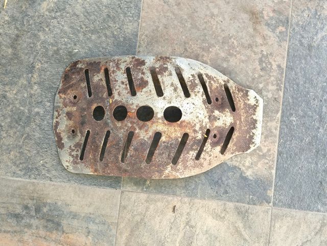 Protector de metal para moto Bultaco. Presenta signos de óxido debido al paso del tiempo. - Diseño con múltiples ranuras. - Agujeros para sujeción.